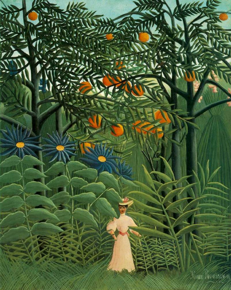 L’exotisme abonde dans son œuvre même si Rousseau n’a pratiquement jamais quitté Paris. Son exotisme est imaginaire et stylisé, issu du Jardin des Plantes, du jardin d’acclimatation, des revues illustrées ou bien des revues de botanique de l’époque.